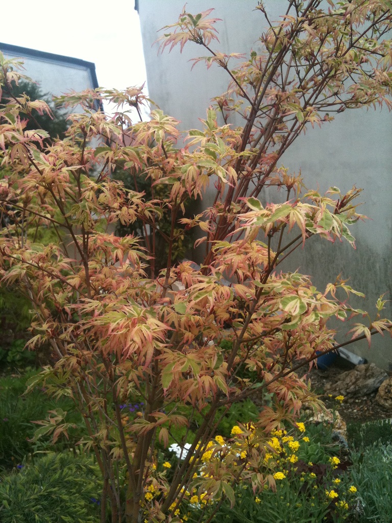 Très bel arbuste de croissance lente à petites feuilles lobées, gris-vert marginées de rose au printemps, virant au crème.